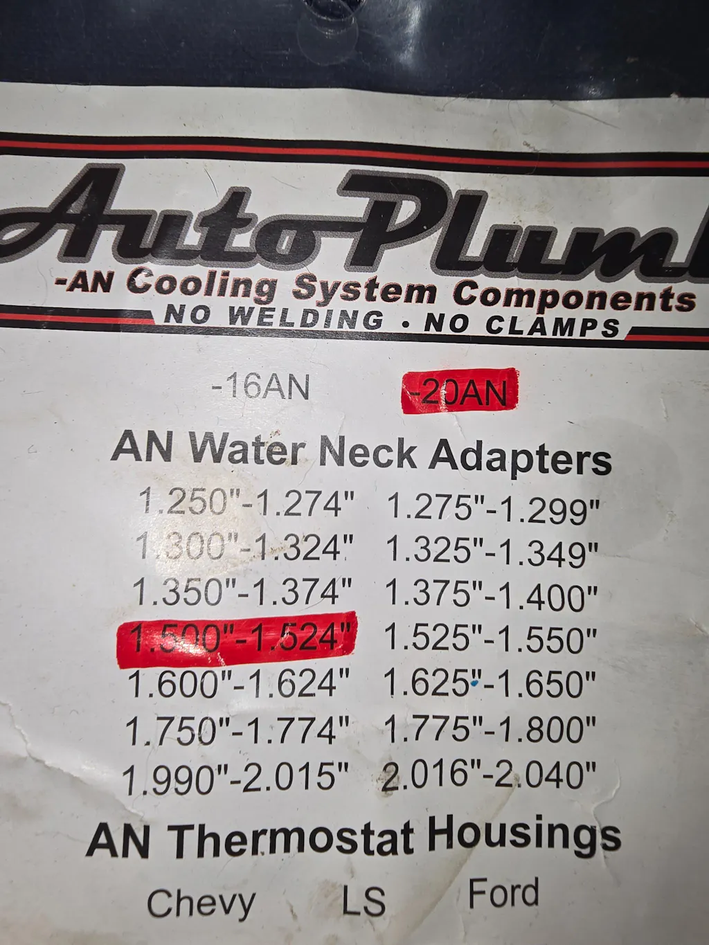 Amazing company, great product. I have been running the -20 Autoplumb adapter, hose, waterneck and fittings on my 383 for over a year without any problem at all. I had an issue last month with something that was likely something I may have done, the adaptor came off (again, not an adapter issue). The guys at Autoplumb immediately got back to me and shipped a new seal and shim fast enough that I was able to get it back together and to a meet up a couple days later.